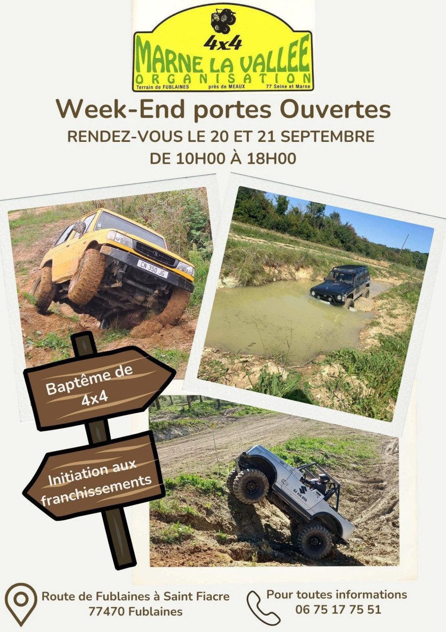 Rendez-vous au terrain de Fublaines ce week-end pour les portes ouvertes 4x4 organisées par Marne la Vallée Organisation. Vous pourrez faire un tour dans l'un des véhicules, vous initier au fameux franchissement ou encore faire des essais libres, vous mêmes, sur des zones adaptées. Rendez-vous samedi et dimanche de 10h à 18h au niveau du terrain, route de Fublaines à Saint-Fiacre, pour profiter de l'ambiance conviviale.