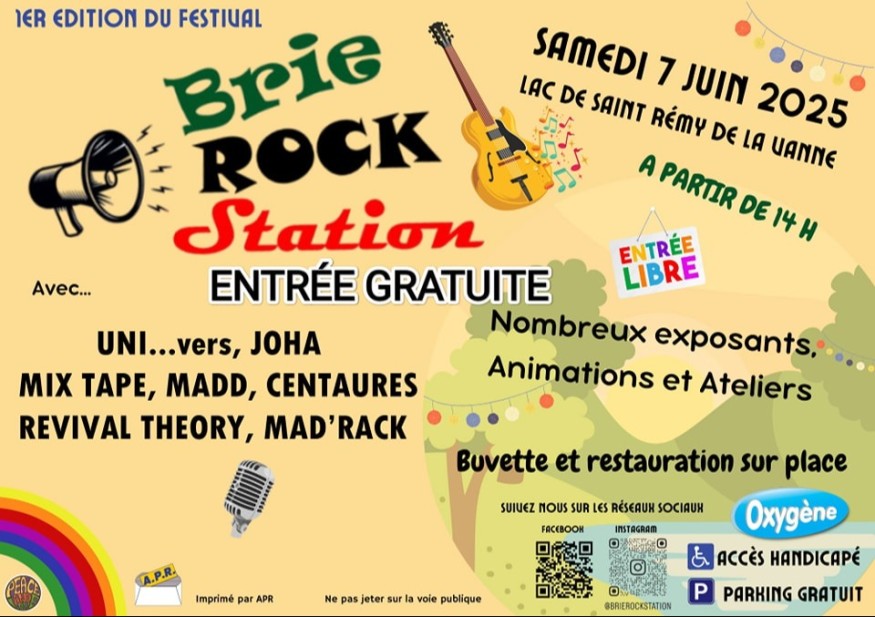 Le nouveau festival Brie Rock Station aura lieu ce samedi au niveau du plan d'eau de Saint-Rémy-de-la-vanne. Au programme : les concerts de 7 groupes, mais aussi divers exposants, des animations et des ateliers pour enfants et adultes. Avec bien sûr la buvette et la restauration sur place. Le parking sera gratuit. Rendez-vous dès 14h samedi au plan d'eau de Saint Rémy de la vanne.