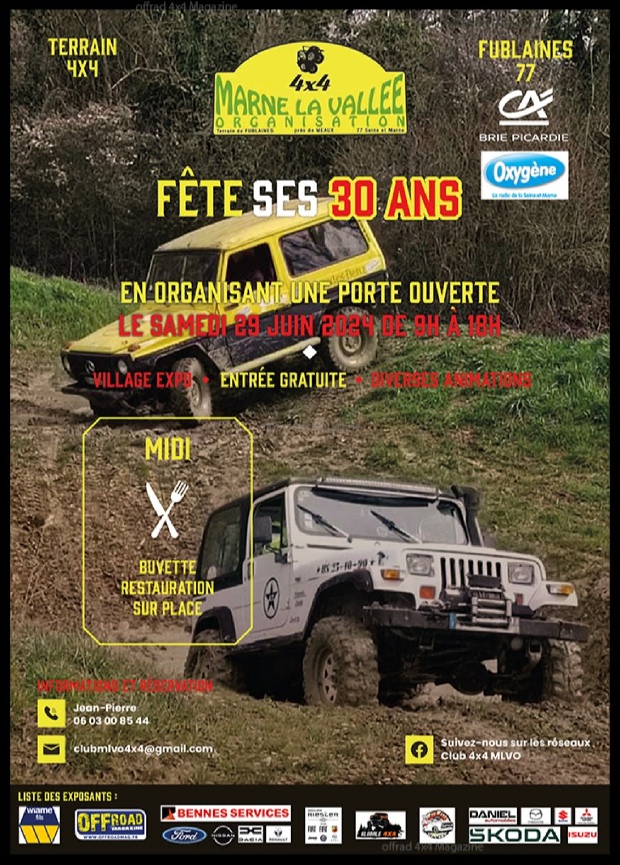 Les Portes ouvertes de l'association Marne la vallée organisation à Fublaines samedi. Le terrain 4x4. Vous y retrouverez un village expo, des animations, des stands de restauration... Démonostration de pilotage, baptêmes 4x4, roulage libre... Venez découvrir la discipline samedi de 9h à 18h.